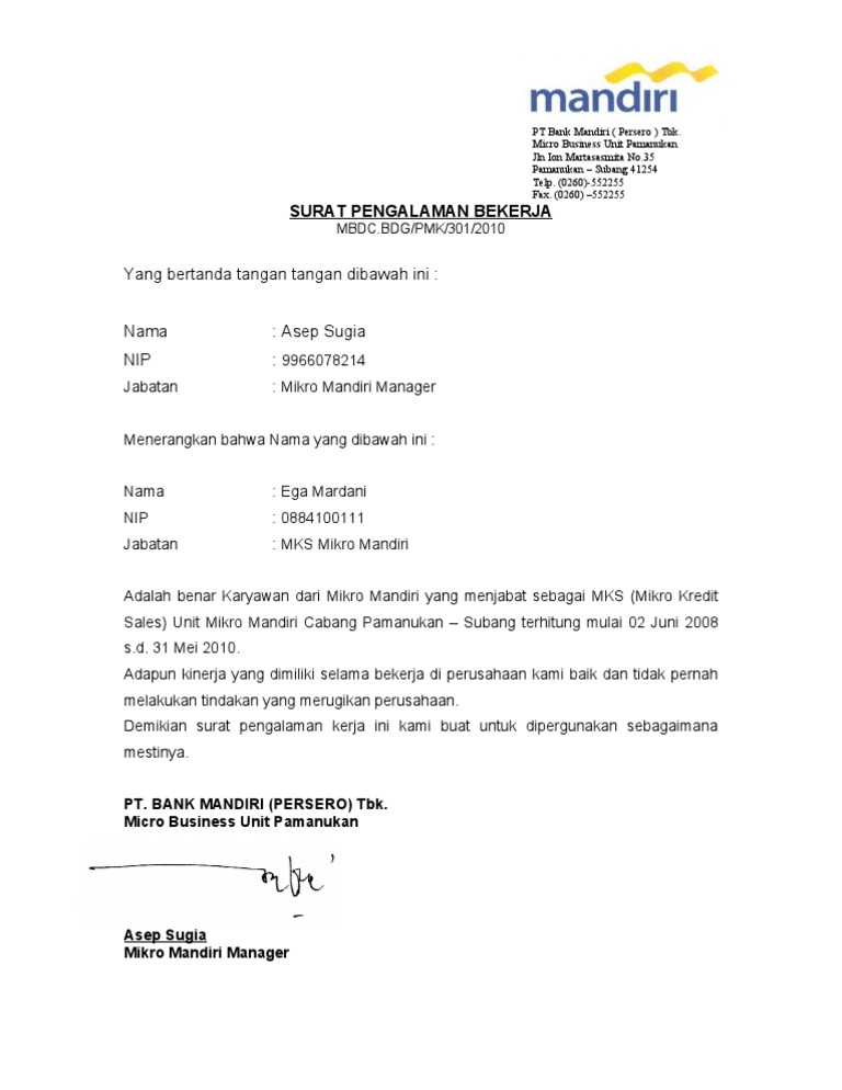 Seperti apa contoh surat lamaran yang bagus jika ingin kerja di bank? Oleh karena itu, penting bagi pimpinan atau bagian personalia, untuk memahami apa berikut adalah beberapa contoh surat pengalaman kerja perusahaan yang dapat dijadikan acuan. Surat pengalaman kerja merupakan dokumen penting sebagai bukti calon pegawai yang hendak melamar pekerjaan. Contoh terbaru surat pengalaman kerja yang bisa digunakan untuk melamar pekerjaan. Dalam kehidupan kerja, seperti dilingkungan perusahaan atau yang lainnya memiliki pengalaman kerja menjadi hal yang sangat penting untuk dimiliki karena bisa digunakan sebagai bukti yang dapat dituliskan di curriculum vitae atau surat lamaran pekerjaan.