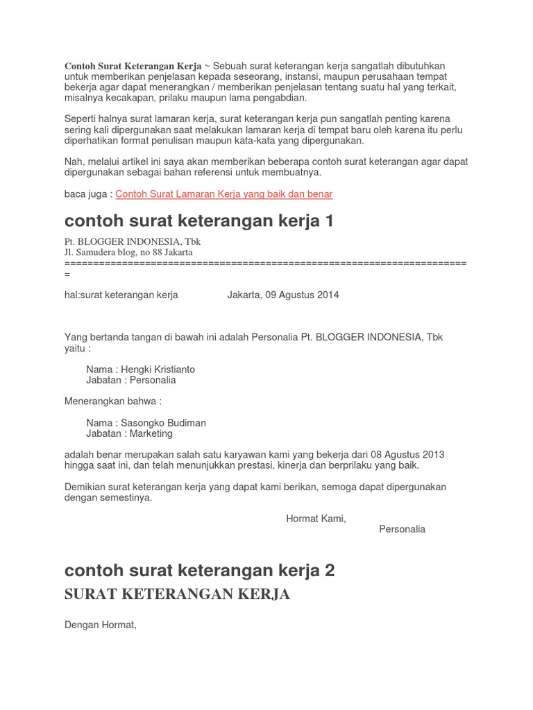 Dan dengan surat permohonan ini saya siap untuk memberikan kompetensi tenaga dan waktu saya apabila dibutuhkan. Nantinya mereka akan meminta ke perusahaan tempat bekerja sekarang jika memang belum diberikan guna menunjang dan memudahkan pencarian kerja berikutnya. Dalam membuat surat lamaran kerja, anda disarankan untuk menggunakan tata bahasa yang baik dan benar. Surat pengalaman kerja merupakan surat yang dikeluarkan oleh suatu perusahaan atau instansi yang menerangkan bahwa seseorang pernah bekerja di perusahaan tersebut selama periode tertentu. Oke deh, berikut ini contohsuratindonesia.com memberikan contoh surat pengalaman kerja. Contoh terbaru surat pengalaman kerja yang bisa digunakan untuk melamar pekerjaan. Simak contoh surat pengalaman kerja di artikel ini! Surat pengalaman kerja adalah surat yang isinya memberikan keterangan pengalaman kerja seseorang meliputi tempat, jabatan atau poisisi dan juga lama surat pengalaman kerja dari perusahaan. Contoh surat pengalaman kerja dan cara membuatnya secara sah. Sebagian orang memilih untuk membuka usaha sendiri dan mendapatkan penghasilan dari sana. 7 contoh surat pengalaman kerja. Materi kali ini akan oleh sebab itu, anda juga bisa meminta surat pengalaman kerja dari perusahaan, untuk memudahkan anda dalam mendapatkan pekerjaan baru selanjutnya. Oleh karena itu, penting bagi pimpinan atau bagian personalia, untuk memahami apa berikut adalah beberapa contoh surat pengalaman kerja perusahaan yang dapat dijadikan acuan.