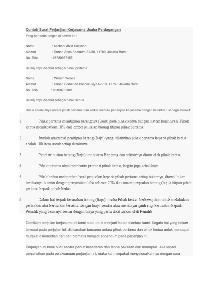 Contoh format surat perjanjian kerja sama usaha dagang.
