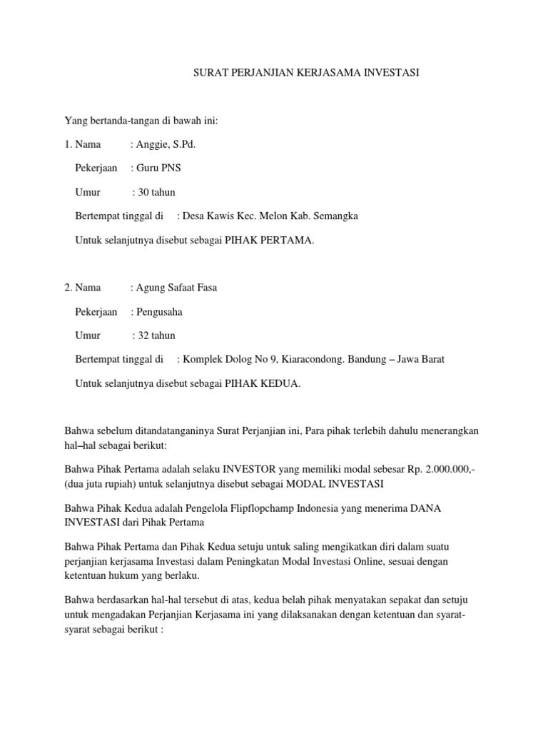 Pengertian dan penggunaan perjanjian kerjasama. Memberikan investasi modal kepada pihak lain. Contoh surat » surat perjanjian » contoh surat perjanjian kerjasama investasi modal usaha. Surat perjanjian lebih menjamin kerjasama bisnis akan berjalan sebagaimana mestinya. Yang bertanda tangan di bawah ini :
