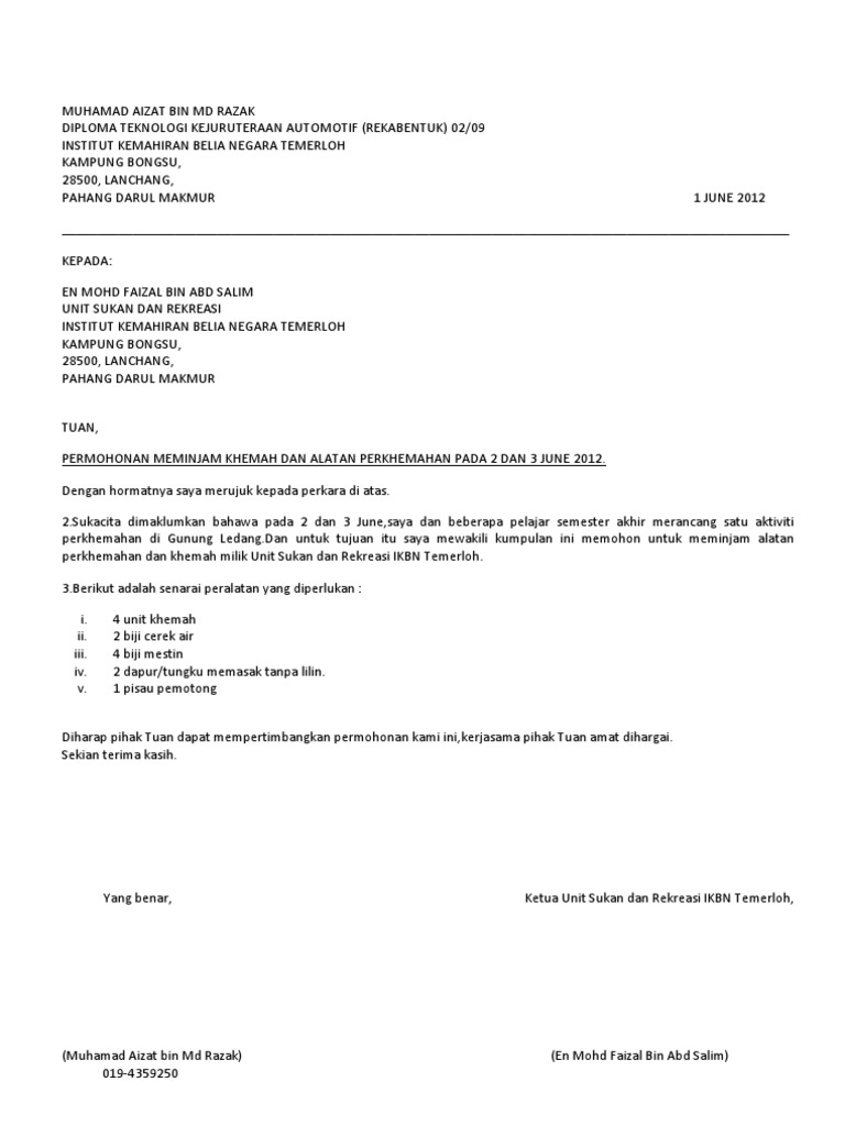 Documents similar to contoh surat permohonan peminjaman alat. Apakah perlu meminjam sebuah lokasi melalui surat? Contoh surat permohonan peminjaman alat. Kumpulan contoh surat permohonan untuk kerjasama, rekomendasi, bantuan dana, permohonan maaf, beasiswa atau keperluan yang lain dengan penulisan yang baik dan benar. Sebuah surat permohonan biasanya berisi tentang sebuah permintaan atau permohonan yang digunakan untuk meminta atau memohon secara halus/res.