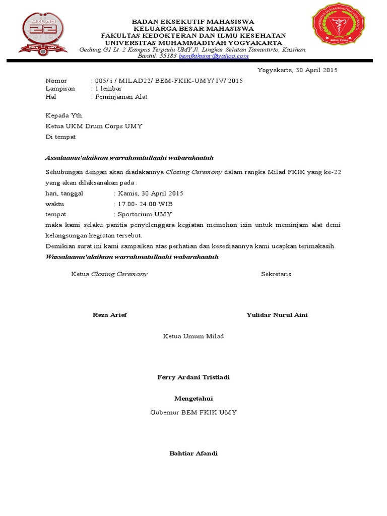 Ketua ukm drum corps umy. Adapun kegiatan ini rencananya akan dilaksanakan pada Sebuah surat permohonan biasanya berisi tentang sebuah permintaan atau permohonan yang digunakan untuk meminta atau memohon secara halus/res. Apalagi jika berurusan dengan pembuatan acara, kegiatan bakti sosial, hingga urusan kedinasan. Surat permohonan sendiri dapat bersifat resmi atau pun tidak resmi. Sebaiknya ya apalagi jika sudah berkaitan dengan sebuah instasi, organisasi. Text of contoh surat peminjaman alat. Contoh surat permohonan untuk dilakukan satu tinjauan kepatuhan. Departemen pendidikan dan kebudayaan universitas indonesia cerdas kota bandung badan eksekutif mahasiswa jalan asem jawa no. Kepala bagian kerjasama universitas penebar harapan jalan kemerdekaan 20 jakarta. Contoh surat permohonan peminjaman alat. Contoh prosedur peminjaman alat/laboratorium 1. Atas segala perhatiannya, kami ucapkan terima kasih.contoh surat permohonan permintaan barang versi 1 jakarta,., maret 2013 kepada yth.